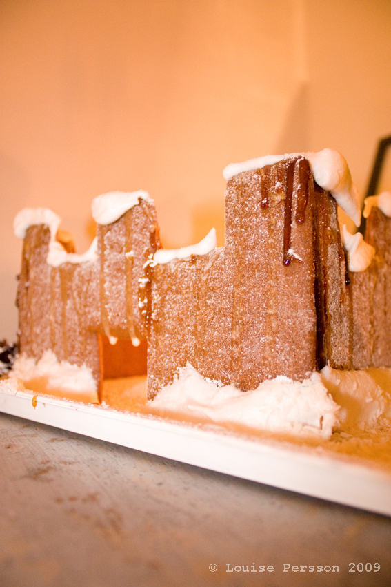 The other day I finished the gingerbread castle, or maybe fort is a more accurate name. I know we are low on the candy, but that will come another next year – please remember I am new at this. On the other hand I am very proud over the snow and icicles. After many requests, all over the world, I publish some pictures of the fantastic art 😉